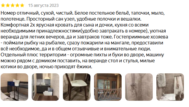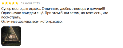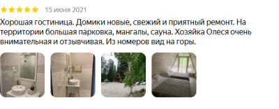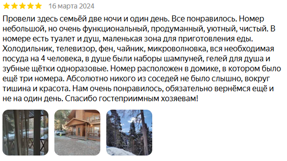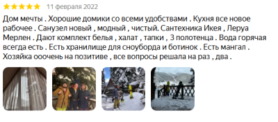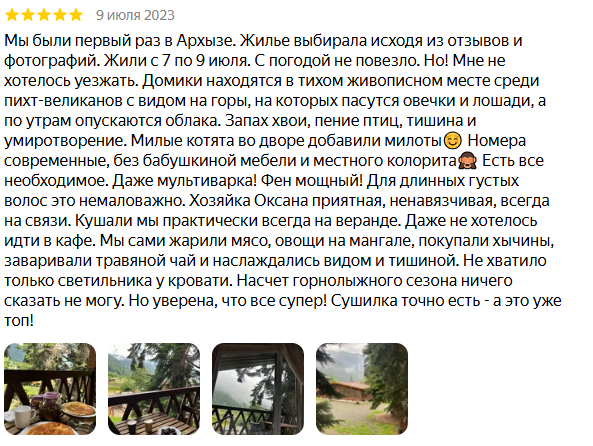 Были в январе, очень понравилось. Домики чистые, уютные, есть все необходимое, удобная гардеробная комната, качественное и белоснежное пастельное белье, также выдают тапочки и халаты. Из номера шикарный вид на горы и просторный балкон со столом и стульями. Во дворе много мангальных зон, пользование бесплатное. Очень радужные и приятные хозяева. Удобное местоположение- недалеко пешком до центра Архыза. Воздух, горы, птички, сосны и номер, в котором приятно находиться!! Это место куда хочется возвращаться снова и снова!!!