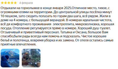 Отдыхали на горнолыжке в конце января 2025.Отличное место, тихое, с огромными елями на территории. До центральной улицы посёлка минут 10 пешком, зато сходить полазать по горам два шага, всё рядом. Жили в доме на 4 номера, с большущей верандой. В номерах идеальная чистота, всё дя комфортного проживания- электроплита, микроволновка, хорошая посуда. Отопление регулируется прямо в номере. Хороший душ-туалет. Отзывчивый и приветливый персонал. Татьяна и Оксана, большое Вам спасибо,были рады всегда нам помочь и подсказать. Чистое хорошее бельё и полотенца, вовремя уборка и их замена. От отеля остались самые приятные впечатления.