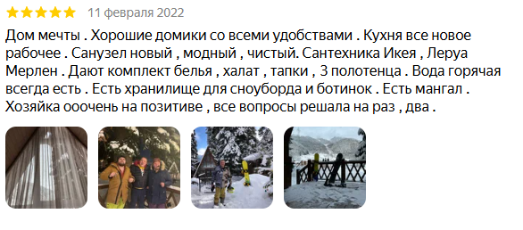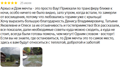 Отзывы пишу редко, но хочу поделиться приятными впечатлениями об отдыхе. Выбрал это место по отзывам, при заселении все что писали оказалось так как писали и даже лучше. Очень удобное место. Первое, находиться база отдыха в конце поселка Архыз , что очень удобно при выезде на склоны. То есть не нужно собирать пробки в поселке. Сел, поехал и выехал. Очень удобно при пиковых загрузках курорта. Второе, базе находится в тихом месте. Ты на едине с природой, горами и уютным комфортом. Ну и третье, на мой взгляд самое важное! Очень доброжелательные, вежливые хозяева базы. С первых секунд пребывания ощущение, что попал в то место которое хотел. Быстрое заселение, если что нужно все подскажут и помогут, сервис на высшем уровне. В домиках все есть, от бытовых условий до посуды. Мангальные зоны просто прелесть. Есть сауна. В следующем году обязательно приедем в Дом Мечты. Всем советую