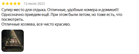 Прекрасное место! Номер был супер чистый, уютный, есть все необходимое для отдыха, из дома нужно взять только вещи, хорошее настроение и немного продуктов для перекуса. Персонал вежливый, гостеприимный. Место очень красивое, везде растут сосны, ели. Дома и деревья украшены гирляндами и фонарями, создавая невероятную праздничную атмосферу. Дети были особенно впечатлены. Большое спасибо! Обязательно приедем еще!