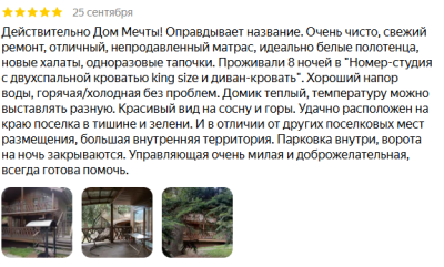 Снимали двухэтажный домик в "Доме мечты" по рекомендации друзей, не пожалели! Встретили нас дружелюбно, заселили в наш дом, всё было абсолютно так же, как на фото, кровати удобные, всё свежее и красивое! Отдельно хочу подметить расположение, оно очень хорошее, здесь тихо и спокойно, отдыхаешь душой и телом, виды вокруг невероятные! Соотношение цена/качество на высоте, лайк!